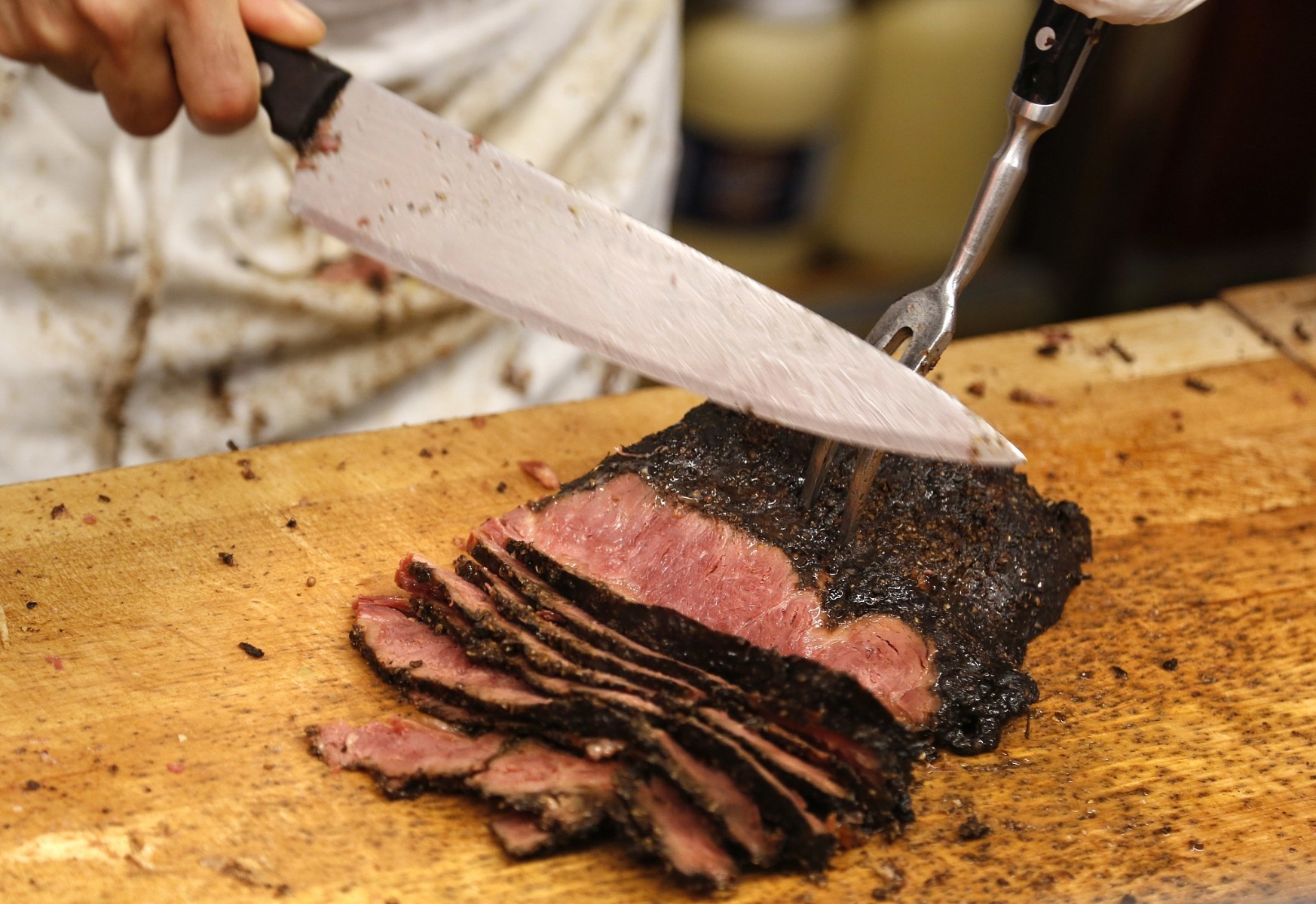 After each piece is rubbed, the meat is slowly smoked for hours in our customized house smokers. During the smoking process, the proteins and fats are slowly cooked and rendered and absorb the smoky flavor. Now, the navel has officially been transformed into Katz’s pastrami!