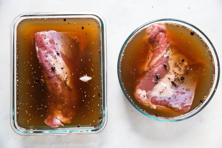 We begin by submerging the navel in saltwater brine, which includes many different spices. This infuses the meat with flavor and gives pastrami its distinctive pink color, even when fully cooked. The meat stays in the brine for weeks, absorbing flavor.